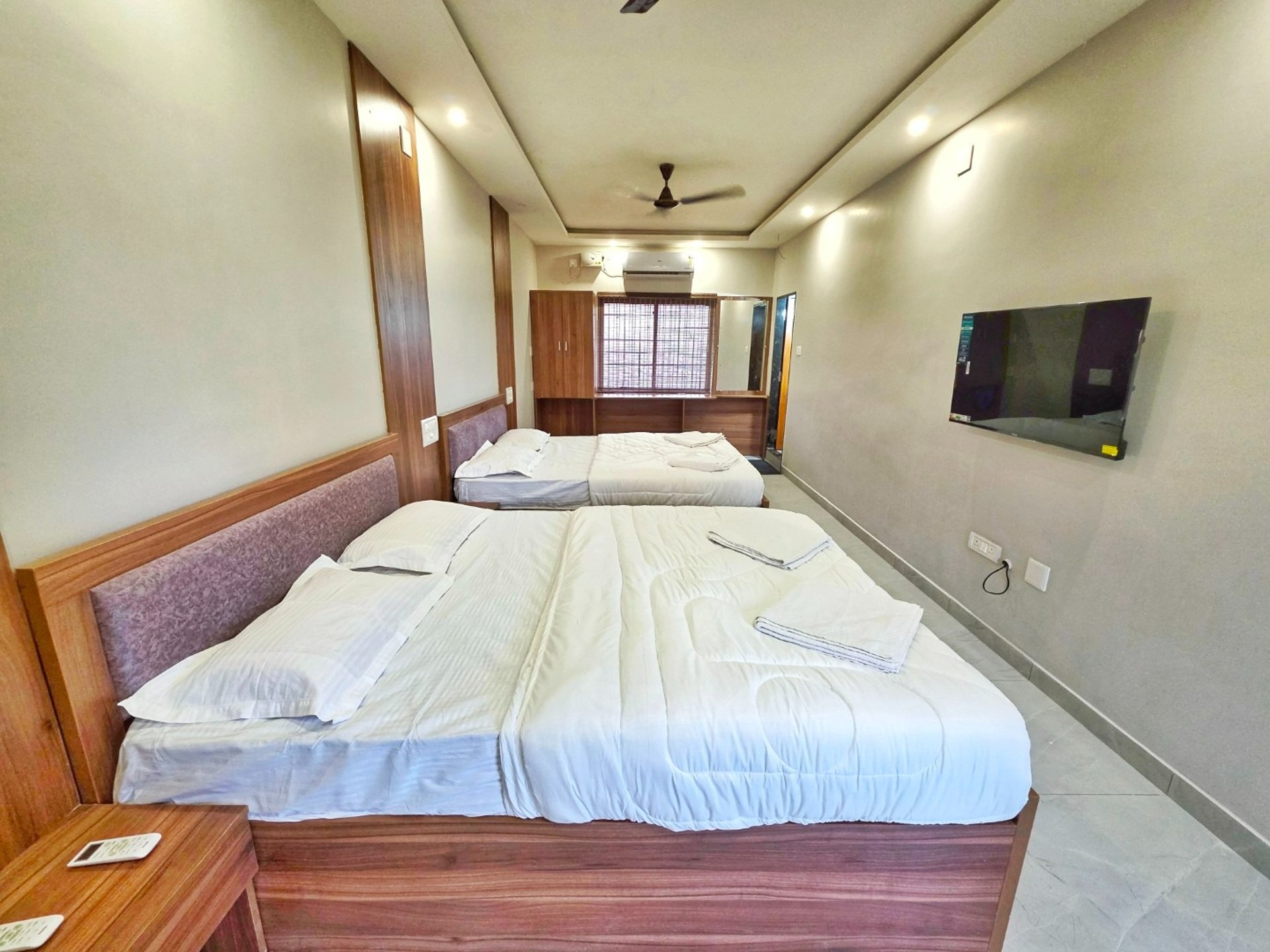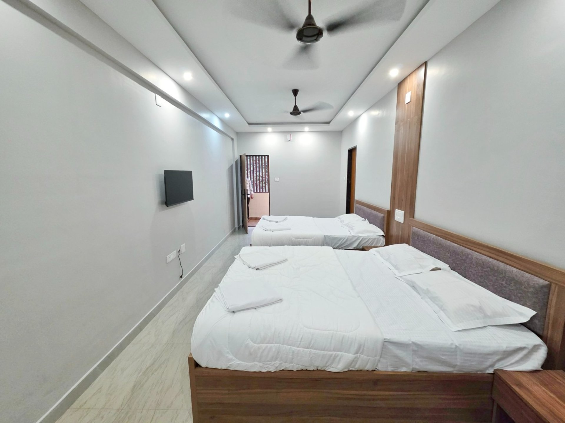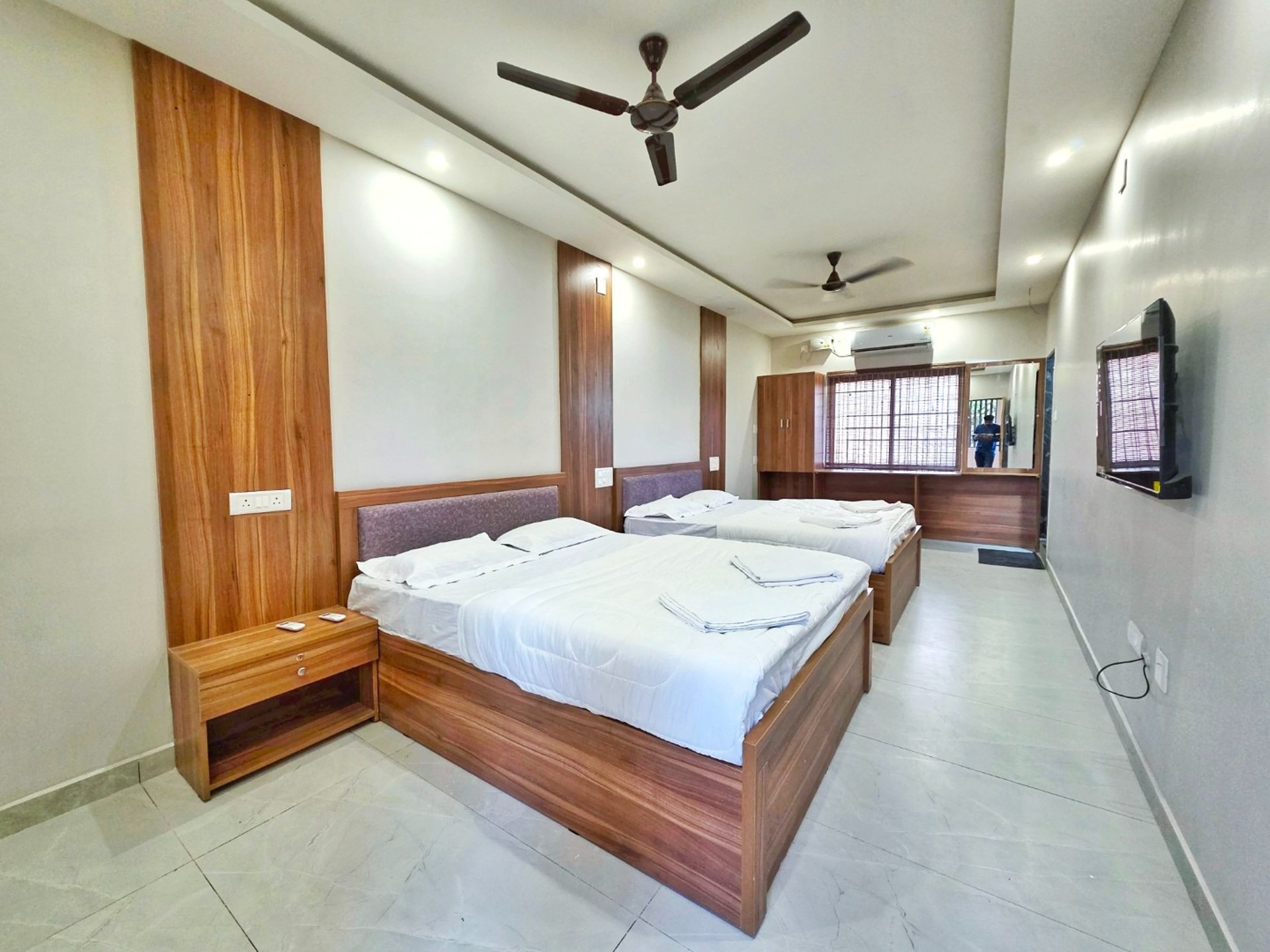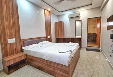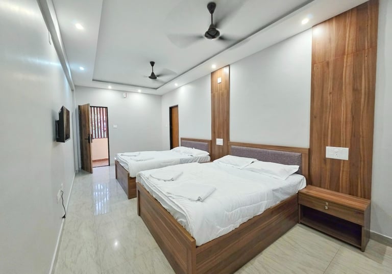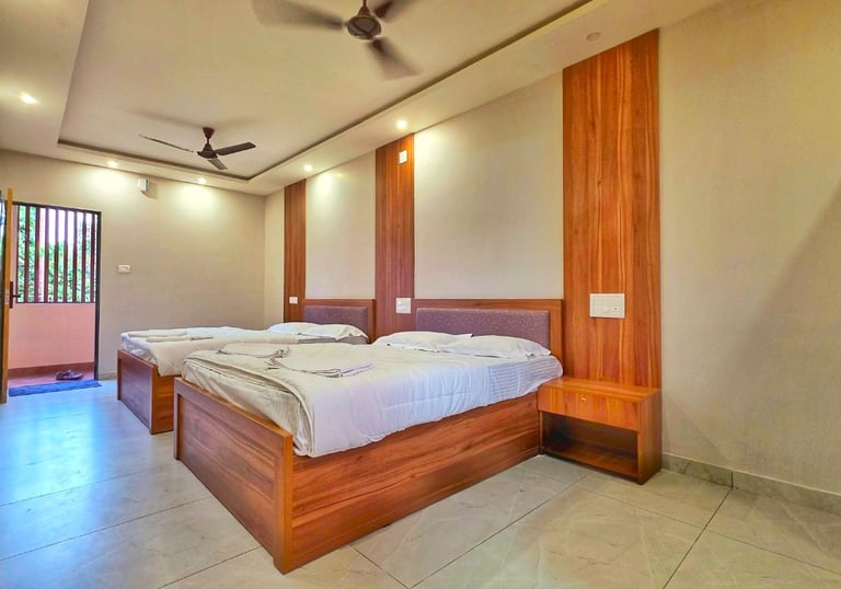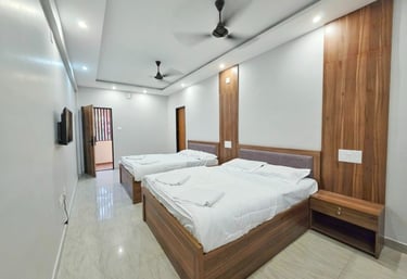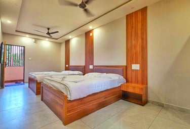 4 Deluxe Family Rooms, each offering thoughtfully spacious rooms designed for families or groups. Every room includes two comfortable king-size beds, accommodating up to four guests, along with an attached bathroom with geyser, air conditioning, wardrobe, TV with cable connection, study table, and high-speed Wi-Fi — ensuring a perfect blend of comfort and convenience for your stay.