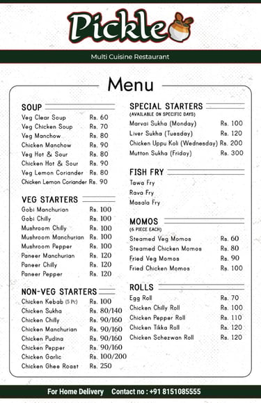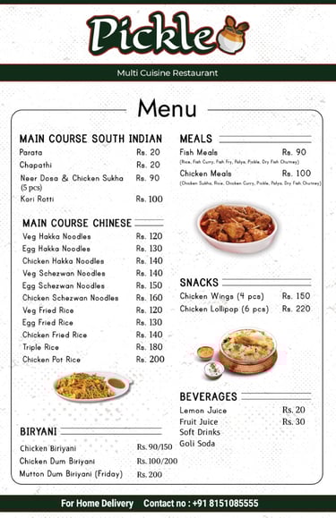Indulge in a delightful dining experience at our partner restaurant, Pickle — where coastal favorites meet the vibrant flavors of India. From sizzling Chicken Ghee Roast and flavorful Mutton Sukha to comforting Kori Rotti, Fried Rice, and Schezwan Noodles, every dish is crafted to please your palate. Pair your meal with refreshing Lemon Juice or classic Goli Soda and enjoy an unforgettable culinary journey in every bite.