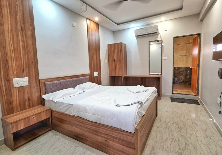 We offer three well-appointed single bedrooms, each designed for comfort and convenience. Every room features a spacious layout with a king-size bed, attached bathroom with geyser, air conditioning, wardrobe, study table, TV with cable connection, and high-speed Wi-Fi — perfect for a relaxing and connected stay.