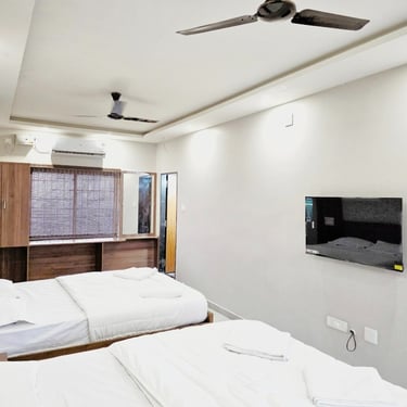 We offer four spacious Deluxe Family Rooms, each thoughtfully designed for families or groups. Every room includes two comfortable king-size beds, accommodating up to four guests, along with an attached bathroom with geyser, air conditioning, wardrobe, TV with cable connection, study table, and high-speed Wi-Fi — ensuring a perfect blend of comfort and convenience for your stay.