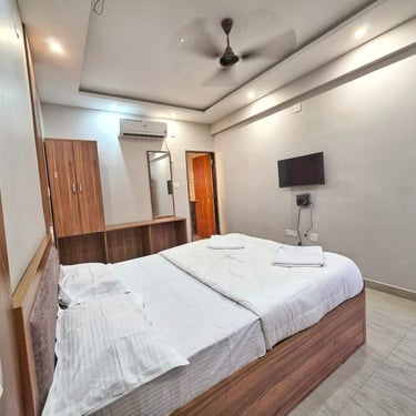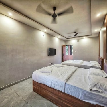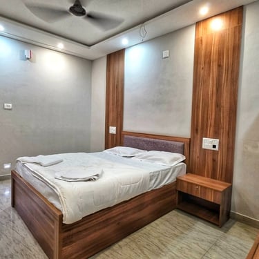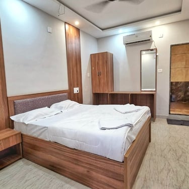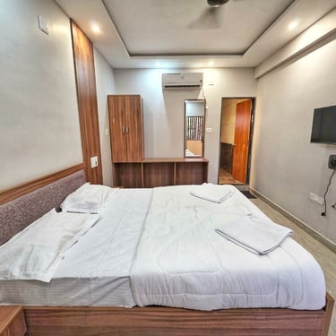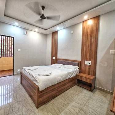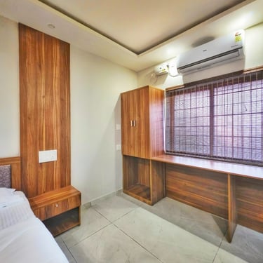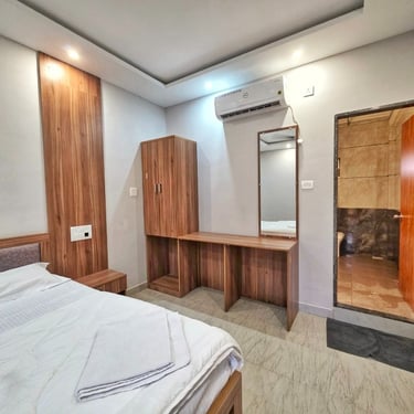 We offer three well-appointed single bedrooms, each designed for comfort and convenience. Every room features a spacious layout with a king-size bed, attached bathroom with geyser, air conditioning, wardrobe, study table, TV with cable connection, and high-speed Wi-Fi — perfect for a relaxing and connected stay.